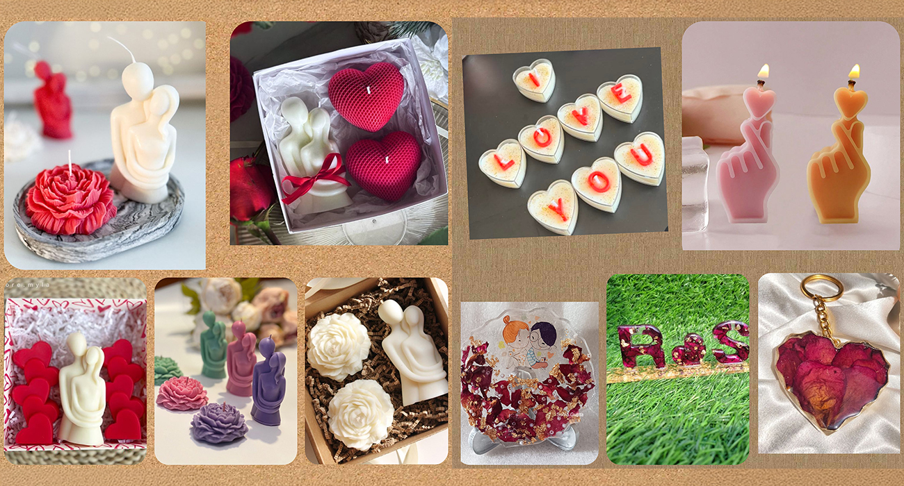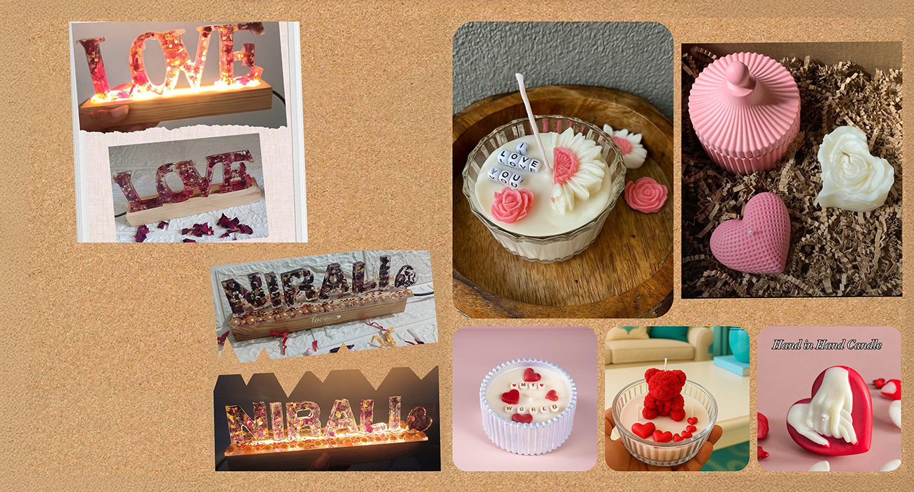 As .. candles, name stand with led light, love symbol, rose preservation articles, photo frame ya keychain, tea lights, coasters , handmade flowers bouquet